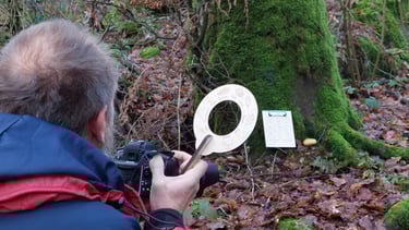We propped the wooden clipboards up against tree trunks so they caught the last of the sunlight. The magnifier was put into a tangle of mossy dead branches on the ground so an impressive turkeytail fungus could be seen through the viewfinder. We managed to photograph everything before the light faded, although I think we may have looked a little odd to passing dog walkers!